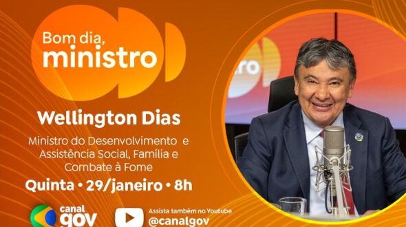 O ministro do Desenvolvimento e Assistência Social, Família e Combate à Fome, Wellington Dias, é o convidado do programa "Bom Dia, Ministro" nesta quinta-feira, 29 de janeiro. Durante a entrevista com rádios e portais de notícias de várias regiões do país, a partir das 8h, ele abordará a chegada do Programa Gás do Povo em todas as capitais do Brasil e assuntos de destaque da pasta.