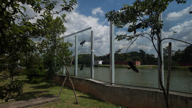 Após quase quatro anos desde a inauguração, o muro de vidro que separa a raia olímpica da USP e a marginal Pinheiros segue com placas quebradas. As obras dali estão paralisadas desde o início da pandemia da Covid-19, em março de 2020.