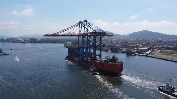 Os dez equipamentos da empresa chinesa ZPMC chegaram sábado (10) ao terminal da Santos Brasil a bordo do navio Zhen Hua 28; investimentos da ordem de R$ 300 milhões têm foco na modernização e descarbonização do terminal