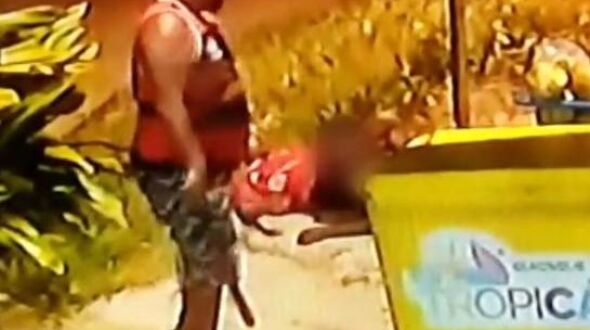 Em seguida ele deixa os objetos no chão, faz um movimento com as mãos para cima e continua falando, aparentando estar alterado. Tira a camiseta e abre o refrigerador, quando um outro homem surge de fora do quiosque, o derruba e começa a espancá-lo.