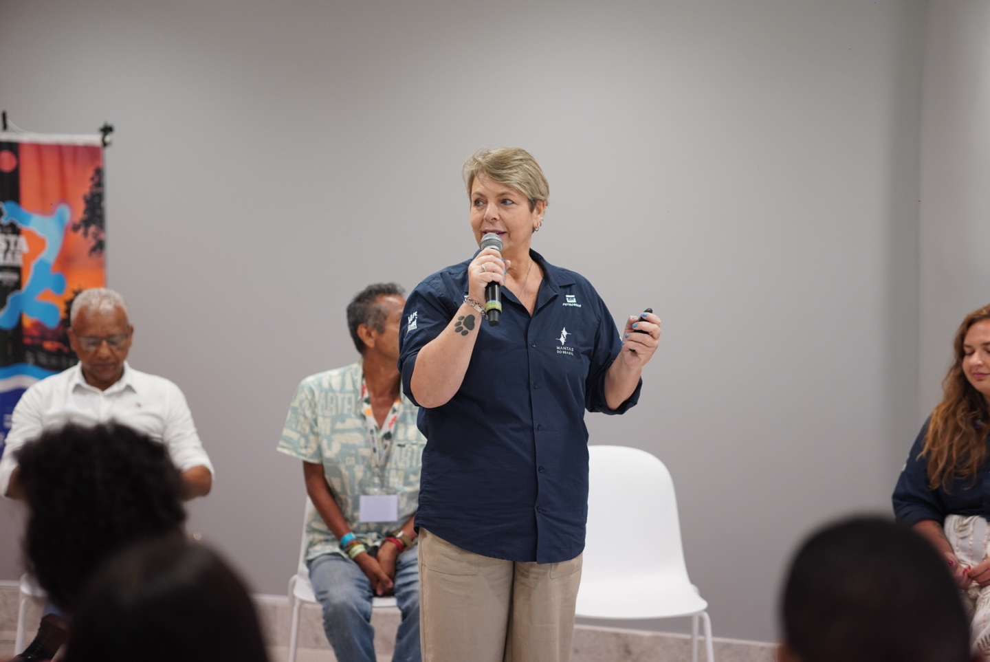 O debate, mediado por Ana Teresa Parente, teve a participação de Thiago Costa, do Projeto Costamar; Paula Romano, coordenadora geral do Mantas do Brasil; Letícia Schabiuk, coordenadora executiva do Mantas do Brasil; Quêner Chaves dos Santos, do Ministério da Pesca; Líder Gongorra, liderança dos Povos do Mar; e Luena Maria, representante dos povos indígenas. Os painelistas discutiram caminhos para integrar o saber tradicional das comunidades à formulação de políticas públicas voltadas à economia azul e à conservação marinha.