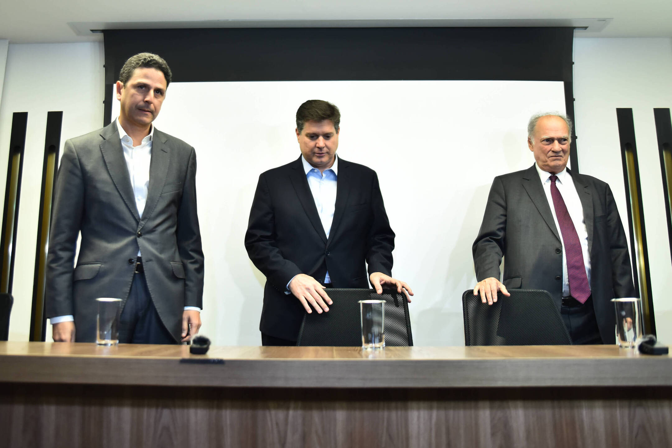 Os presidentes do PSDB, Bruno Araújo, do MDB, Baleia Rossi, e do Cidadania, Roberto Freire, que buscam uma aliança em torno da pré-candidata de Simone Tebet - (foto: Antonio Molina/Folhapress)