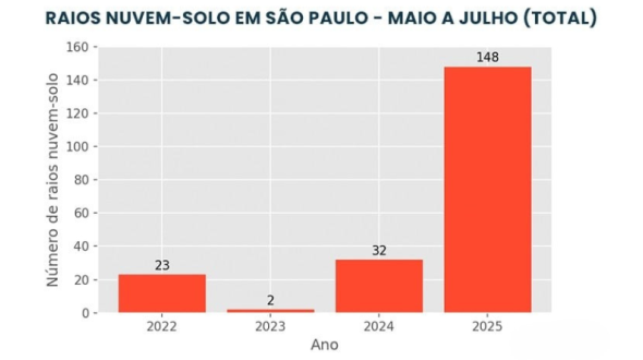 A cidade de São Paulo registrou 148 raios do tipo nuvem-solo entre os meses de maio e julho de 2025. Isso representa um aumento de mais de 360% em relação ao mesmo período do ano passado, quando foram registradas 32 descargas. A maior parte delas ocorreu em junho (97) e maio (51), meses tradicionalmente secos e com baixa atividade elétrica. Os dados são da Climatempo – a maior e mais reconhecida empresa de consultoria meteorológica e previsão do tempo do Brasil e da América Latina, e revelam um comportamento fora do padrão climático, levantando preocupações importantes para os setores de energia e infraestrutura, que dependem de previsibilidade para garantir a continuidade de serviços, execução de obras e segurança de ativos.