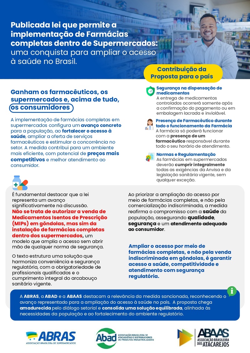"Na prática, a lei trará mais conveniência no dia a dia, com farmácias completas no local onde as famílias já fazem suas compras. A medida acompanha uma realidade clara: o Brasil está envelhecendo, a demanda por saúde cresce e o consumidor busca soluções cada vez mais práticas e integradas. Ao mesmo tempo, o avanço do bem-estar e da prevenção já faz parte da rotina das pessoas. Com a presença dos supermercados em todo o país, essa iniciativa tem potencial de ampliar o acesso à saúde de forma significativa. Mais facilidade, mais acesso e mais cuidado com a população", afirma Galassi.