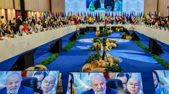 COP30 — O líder brasileiro também citou a COP30, realizada na Amazônia, como uma oportunidade para a região liderar a transição energética e mostrar que conservar as florestas é cuidar do futuro do planeta. "O Fundo de Florestas Tropicais para Sempre [TFFF] é uma solução inovadora para que nossas florestas valham mais em pé do que derrubadas", mencionou Lula, sobre o TFFF lançado na Cúpula de Líderes da COP30, na última quinta-feira (dia 6 de novembro) .