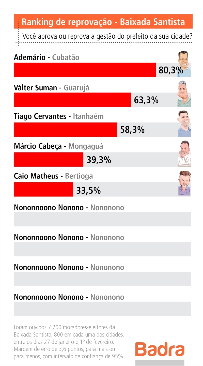 Até o momento, Ademário Oliveira (PSDB) é o prefeito com a maior reprovação. Ele, em Cubatão, foi reprovado por 80,3% das 800 pessoas entrevistadas na cidade. Em seguida vem Válter Suman (PSDB), de Guarujá, com reprovação de 63,3%, depois Tiago Cervantes, de Itanhaém, com 58,3%. Márcio Cabeça, de Mongaguá, aparece quarto lugar, com 39,3%, e, por último, Caio Matheus, de Bertioga, reprovado por 33,5%.