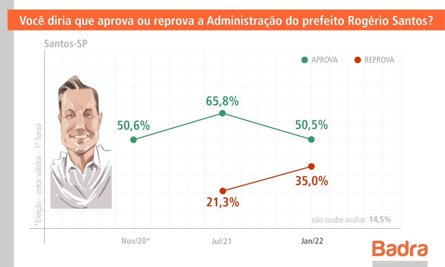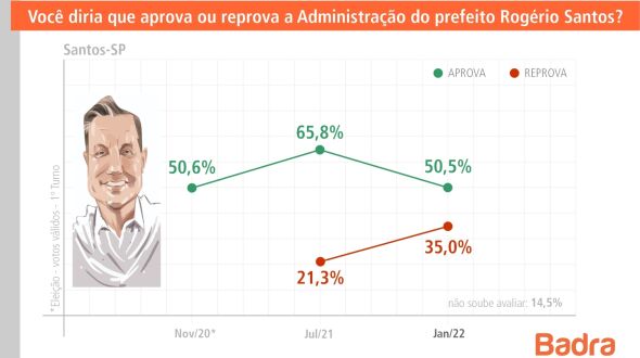 Eleito no primeiro turno em dezembro de 2020, com 50,6% dos votos válidos, o prefeito de Santos, Rogério Santos, do PSDB, encerra o primeiro ano de seu governo aprovado exatamente por 50,5% dos moradores eleitores, num desempenho que pode ser considerado elogiável, sobretudo quando comparado com o da maioria dos prefeitos da Região.