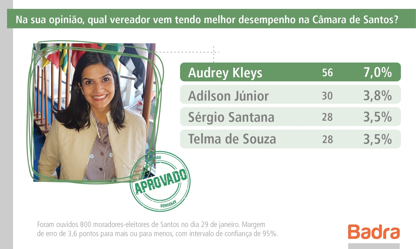 Atualmente em seu segundo mandato parlamentar, e tendo sido eleita com a segunda maior votação em 2020, nada menos do que 5.863 votos, a jornalista Audrey Kleys (PP) foi considerada por exatos 7% dos entrevistados como a parlamentar com melhor desempenho no Legislativo Santista. O percentual corresponde a 56 citações nominais e espontâneas. “Ainda que seja bem alto o número de entrevistados que não consegue avaliar o desempenho dos vereadores, como se trata de uma pergunta cuja resposta se dá de modo espontâneo, é significativo alcançar essa marca”, argumenta o especialista.