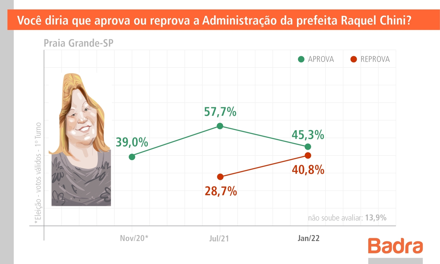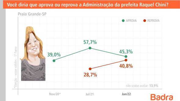 O levantamento foi realizado no último dia 28 de janeiro. Os entrevistados responderam se aprovam ou reprovam a forma de governar da prefeita. Exatos 40,8% do total de ouvidos afirmaram reprovar, enquanto 13,9% não souberam opinar. Em julho do ano passado, em pesquisa realizada pelo mesmo instituto, Chini alcançou uma aprovação de 57,7%, isto é, perdeu, em seis meses, mais de 12%.