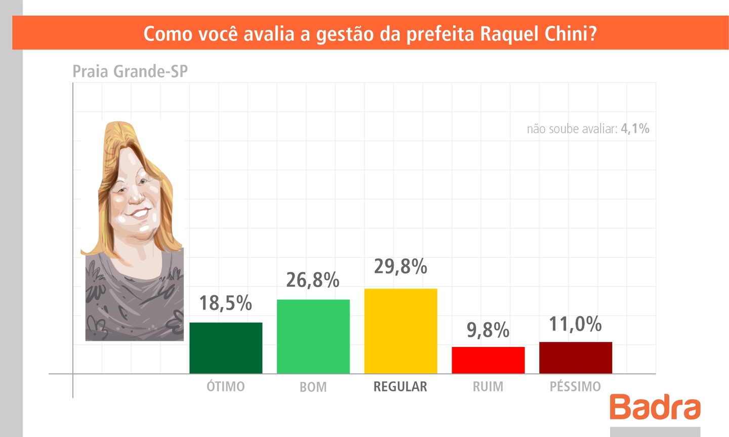 Única mulher a comandar uma prefeitura da Baixada Santista na gestão 2021-2024, a prefeita de Praia Grande, Raquel Chini, do PSDB, tem sua gestão aprovada por 45,3% dos moradores-eleitores de Praia Grande. É o que revela a mais recente rodada de pesquisas realizada pela Badra Comunicação, a pedido do Portal BS9 – Litoral e Vale.