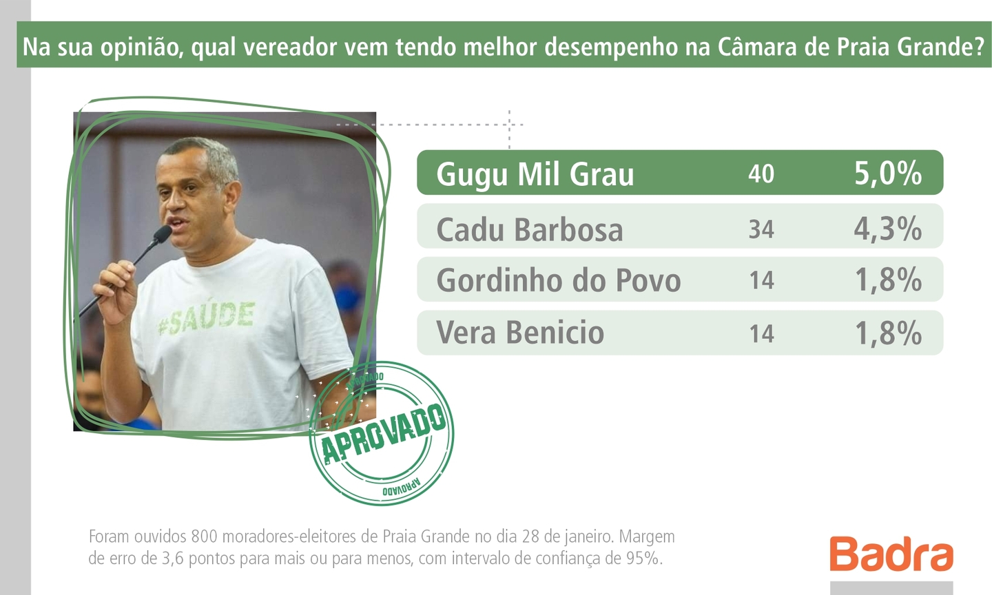 Com uma das menores votações entre os vereadores eleitos, em Praia Grande, em novembro de 2020, 1.018 votos, Gugu Mil Grau é apontado agora, na Pesquisa Badra, segundo a população da cidade, como o parlamentar com melhor desempenho na Câmara. Ele foi citado nominalmente 40 vezes, o que equivale a 5% do total de menções.