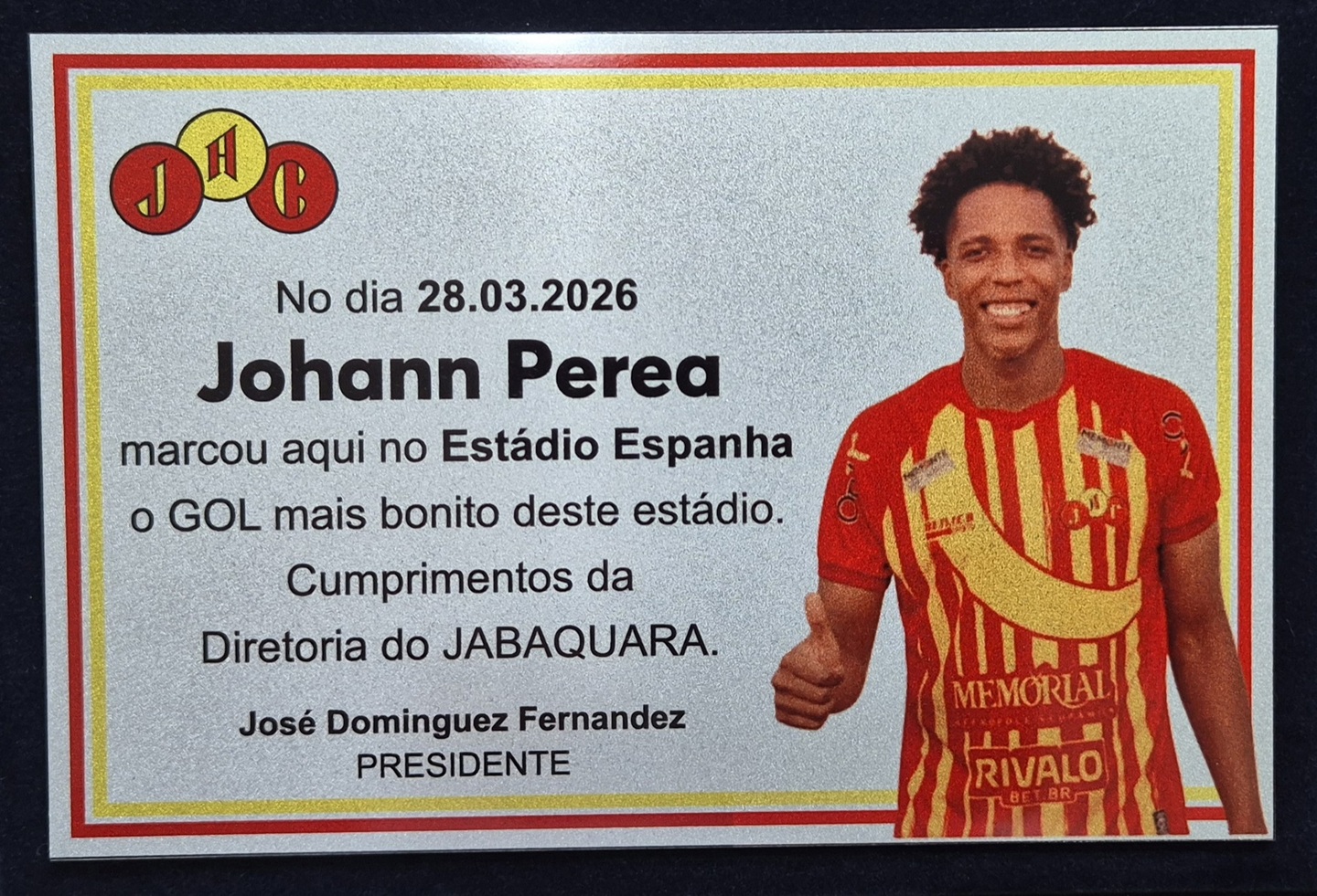 O Jabaquara conta com o apoio da Federação Paulista de Futebol (FPF) para que o gol de antes do meio de campo marcado pelo zagueiro Perea concorra ao Prêmio Puskás 2026. A revelação foi feita pelo presidente do clube santista José Dominguez Fernandez, o Pepe, durante entrega de placa em homenagem ao atleta, em cerimônia realizada na tarde desta segunda-feira na sala da diretoria do Estádio Espanha, com a presença também do treinador Adriano Piemonte.