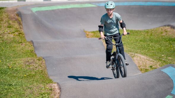 O pump track é um circuito contínuo, com ondulações e curvas, que permite aos praticantes ganharem velocidade por meio do movimento do corpo, além da realização de manobras.