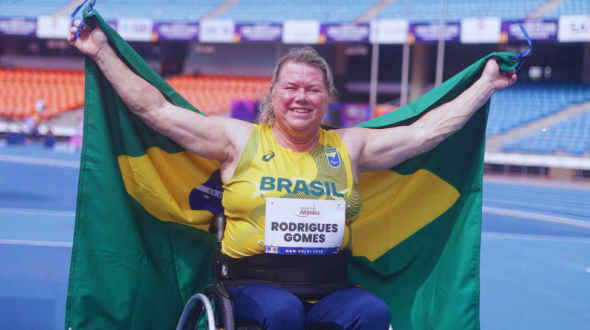 Na madrugada desta terça-feira (30), a paratleta santista conquistou a medalha de prata no arremesso de peso, classe F54, durante o Campeonato Mundial Paralímpico de Atletismo, realizado em Nova Deli, na Índia