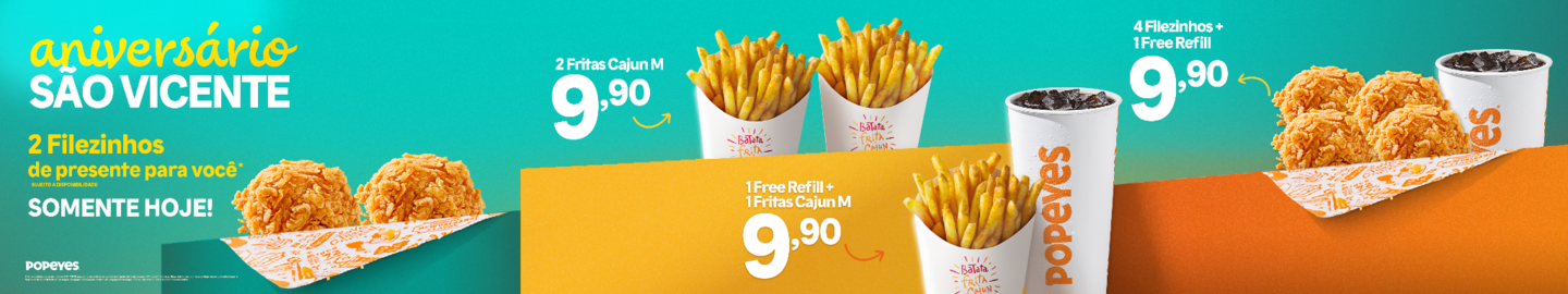 Ofertas válidas somente no dia 22/01/2026 em compras realizadas no Balcão, nos restaurantes de Popeyes® em São Vicente (SP). Limite de um resgate por CPF, dos dois filezinhos. Itens adicionais ou troca de itens serão cobrados à parte. Sujeito à disponibilidade em estoque.