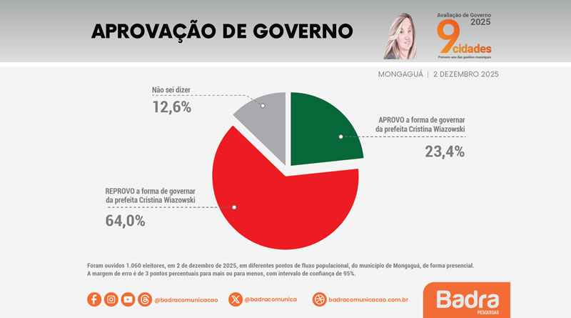 A prefeita Cristina Wiazowski enfrenta, no fechamento de 2025, o momento mais delicado de percepção pública desde que assumiu a Prefeitura de Mongaguá, no Litoral Sul paulista. Pesquisa do Instituto Badra, realizada em 2 de dezembro com 1.060 moradores-eleitores, aponta que 64% desaprovam a forma como a prefeita governa, enquanto apenas 23,4% aprovam — e 12,6% dizem não saber opinar.