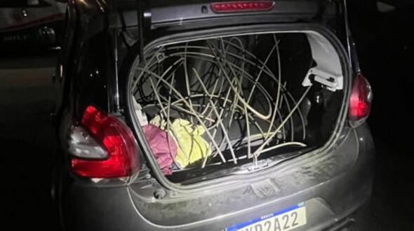 Com os três homens abordados, foram encontrados cerca de 60 metros de fios, que estavam dentro de um veículo, além de oito cartões bancários e dois documentos de identidade que não correspondiam a nenhum deles.