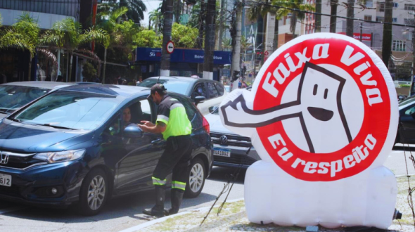 A Companhia de Engenharia de Tráfego (CET-Santos) segue com as ações de adesivagem da campanha a Faixa Viva Segurança no Trânsito é Compromisso de Todos