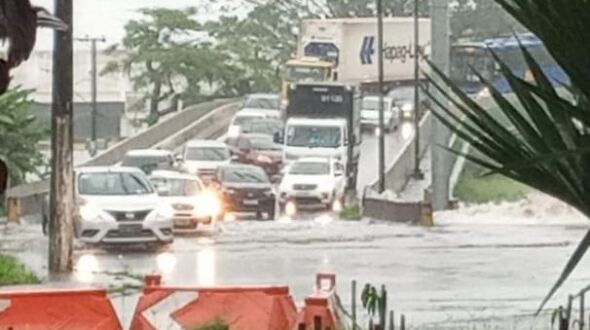 A forte chuva que caiu nas cidades da Baixada Santista na manhã desta segunda-feira, dia 7, castigou novamente moradores de Cubatão, com trânsito completamente parado no Viaduto do Casqueiro e deixando a água chegar na cintura em vias paralelas.