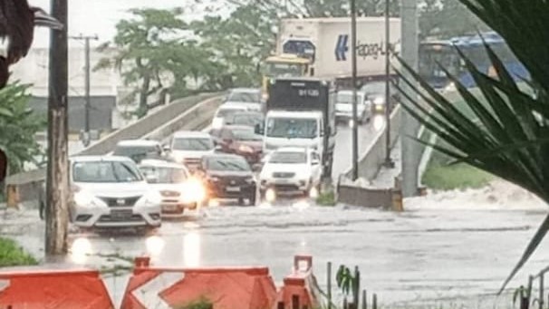 Av. Jornalista Giusfredo Santini completamente alagada em CubatãoPrejuízo aos alunos