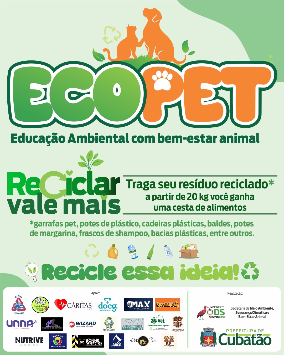 A Prefeitura de Cubatão, por meio da Secretaria de Meio Ambiente, Segurança Climática e Bem-estar Animal, realiza no próximo sábado (18), das 9h às 12h, a ação EcoPet. O evento será no Parque Linear do Pinheiro do Miranda (Rua Faixa do Oleoduto, s/nº) e reúne atividades de educação ambiental e cuidados com os animais de estimação.