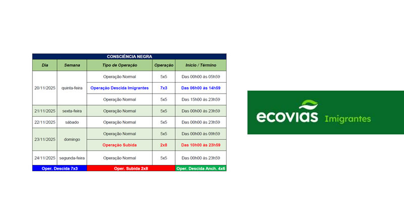 A Ecovias Imigrantes, concessionária responsável pela administração do Sistema Anchieta-Imigrantes (SAI) estima que entre 193 mil e 298 mil veículos utilizem o trecho de concessão para acessar a Baixada Santista durante o feriado da Consciência Negra, celebrado na quinta-feira (20). A contagem será realizada das 0h de quarta-feira (19/11) até às 23h59 de segunda-feira (24/11).