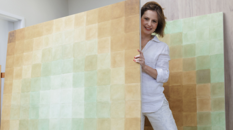 No seu ateliê, Camila desenvolveu fórmulas próprias: uma tinta acrílica feita de café e outra de chá verde, utilizando pigmentos naturais extraídos das infusões.