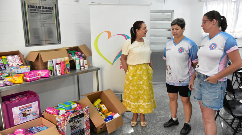 Foram arrecadados centenas de pacotes de absorvente, sabonetes, desodorantes, escovas de dente e muito mais.