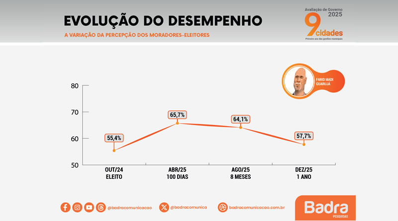 Os dados são do Instituto Badra, especializado em pesquisas de opinião e avaliação de gestões municipais, que ouviu 1.060 eleitores presencialmente em 4 de dezembro, em um levantamento com 95% de confiança e margem de erro de 3 pontos percentuais.