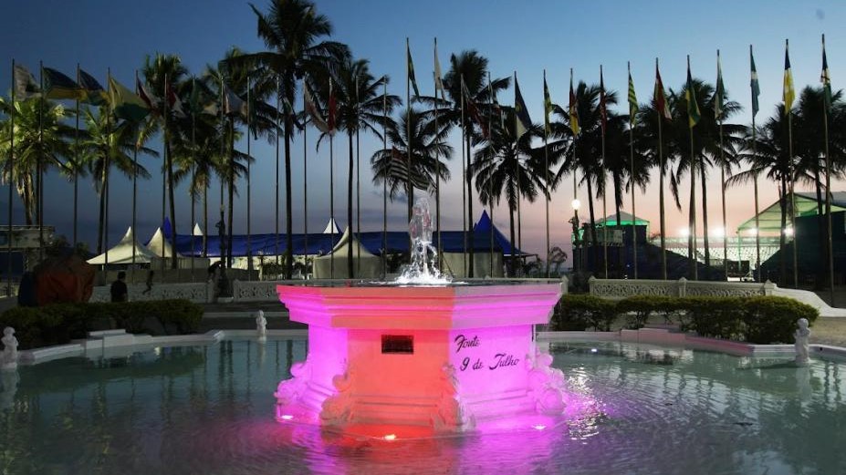 Após uma semana de obras, a Fonte 9 de Julho, mais conhecida como fonte luminosa, na Praça dos Bandeiras, no Gonzaga, voltou a funcionar nesta quinta-feira. A pintura, última etapa do serviço de manutenção, encerrou os trabalhos, que também envolveram esvaziamento da fonte, limpeza completa dos 32 bicos de jato de água e revisão elétrica no sistema de iluminação.