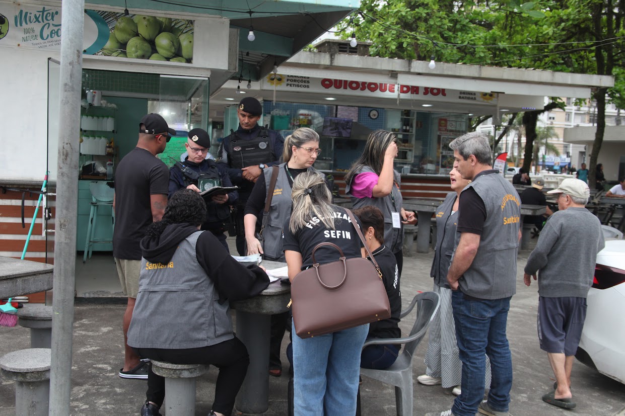 A Prefeitura de Santos realizou, neste domingo (12), força-tarefa para fiscalizar quiosques da praia com equipes da Secretaria de Finanças (Sefin), Vigilância Sanitária (Sevisa), Guarda Civil Municipal (GCM), além de apoio da Secretaria de Comunicação e