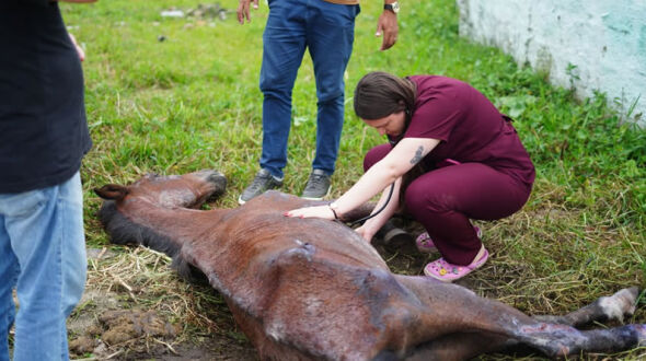 No local, foram realizados procedimentos de suporte, como fluidoterapia intravenosa e aplicação de complexo vitamínico, para estabilizar o animal. Com o auxílio de populares, o equino foi colocado novamente em pé.