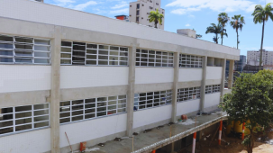 A construção da nova UME Edson Arantes do Nascimento, no Gonzaga, tem 80% dos serviços prontos e deve ser concluída em janeiro de 2026, quando será entregue à Secretaria Municipal de Educação (Seduc), responsável por equipá-la