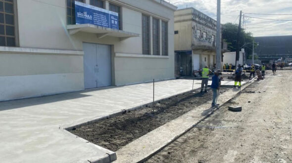 A empreiteira está executando o canteiro central, a concretagem da nova calçada acessível e as duas últimas bocas de lobo do novo sistema de drenagem da área.