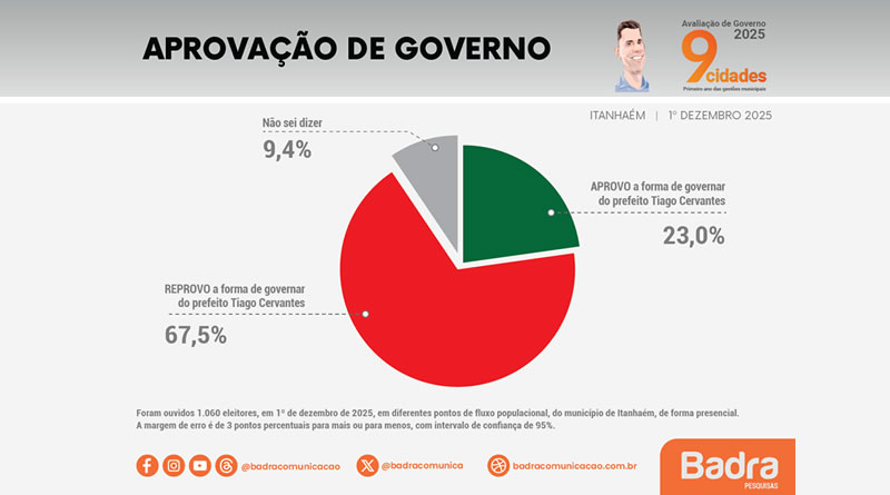 A avaliação do primeiro ano da gestão do prefeito Tiago Cervantes em Itanhaém, no litoral sul paulista, chega ao último quadrimestre de 2025 marcada por um dado duro: 67,5% dos moradores-eleitores dizem reprovar a forma como o governo municipal vem sendo conduzido, enquanto 23% aprovam e 9,4% não souberam responder. Os números são da pesquisa de opinião realizada pelo Instituto Badra, com 1.060 entrevistas presenciais, margem de erro de 3 pontos percentuais e 95% de confiança, em 1º de dezembro de 2025.