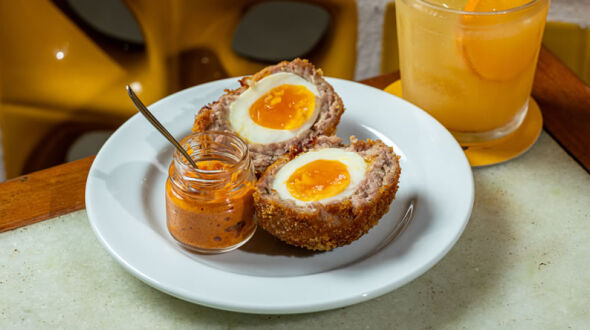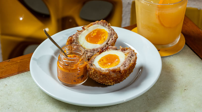 Medalhões de alheira cobertos com espinafre salteado no alho e azeite, coroados de ovo com gema mole e crispy de bacon, com molhinho à lavrador (3 unidades) – R$ 60