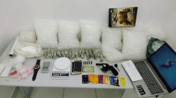 Foram apreendidos notebook, cartões bancários, balanças digitais, celulares e revólver - Foto: divulgação/DEINTER-6