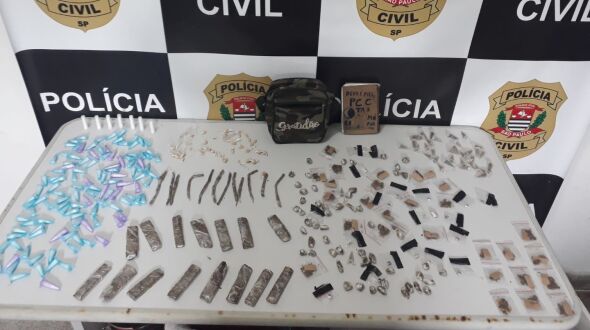 No total foram apreendidas 111 porções de maconha, 123 pinos com cocaína e 41 pedras de crack. - Foto: PCSP