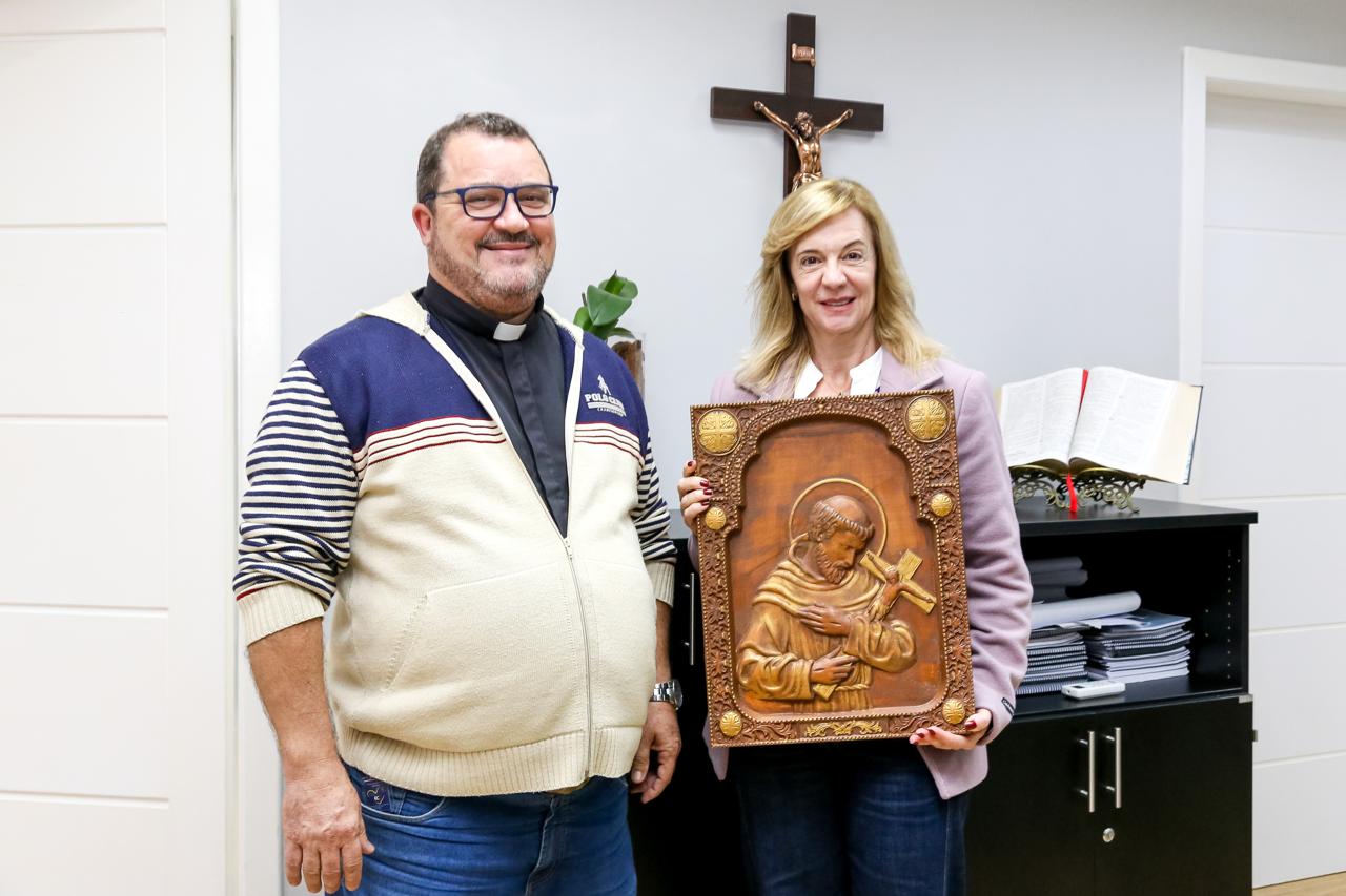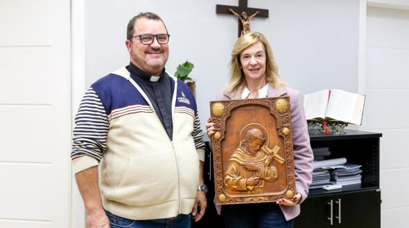 Na ocasião, o religioso presenteou a chefe do Executivo com uma gravura entalhada da imagem de São Francisco de Assis. "É um baluarte da fé. Para que a senhora seja protegida e tenha fortaleza na condução da nossa cidade por caminhos belíssimos. É de coração de nossa paróquia em agradecimento ao suporte da Prefeitura ao nosso evento. Ficam renovadas as nossas preces. E vamos festejar", entoou o padre.