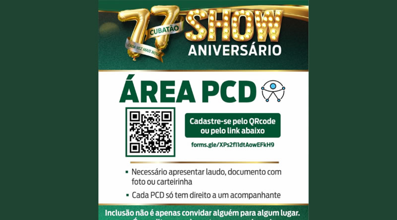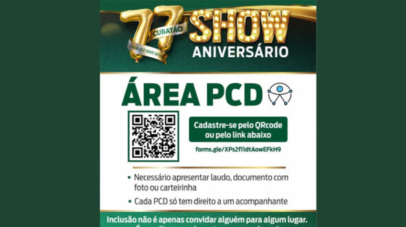 O espaço é reservado para pessoas com deficiência física e intelectual, incluindo aquelas dentro do espectro autista. Para acessar a Área PCD, basta preencher o formulário eletrônico pelo endereço forms.gle/XPs2f11dtAowEFkH9, informar dados pessoais, laudo, CID, os eventos que tem interesse em participar e nome do acompanhante, se necessário. As inscrições devem ser feitas até as 17 horas de quarta-feira (8). Em caso de dúvidas, a população pode entrar em contato pelo WhatsApp (13) 99144-1812.
