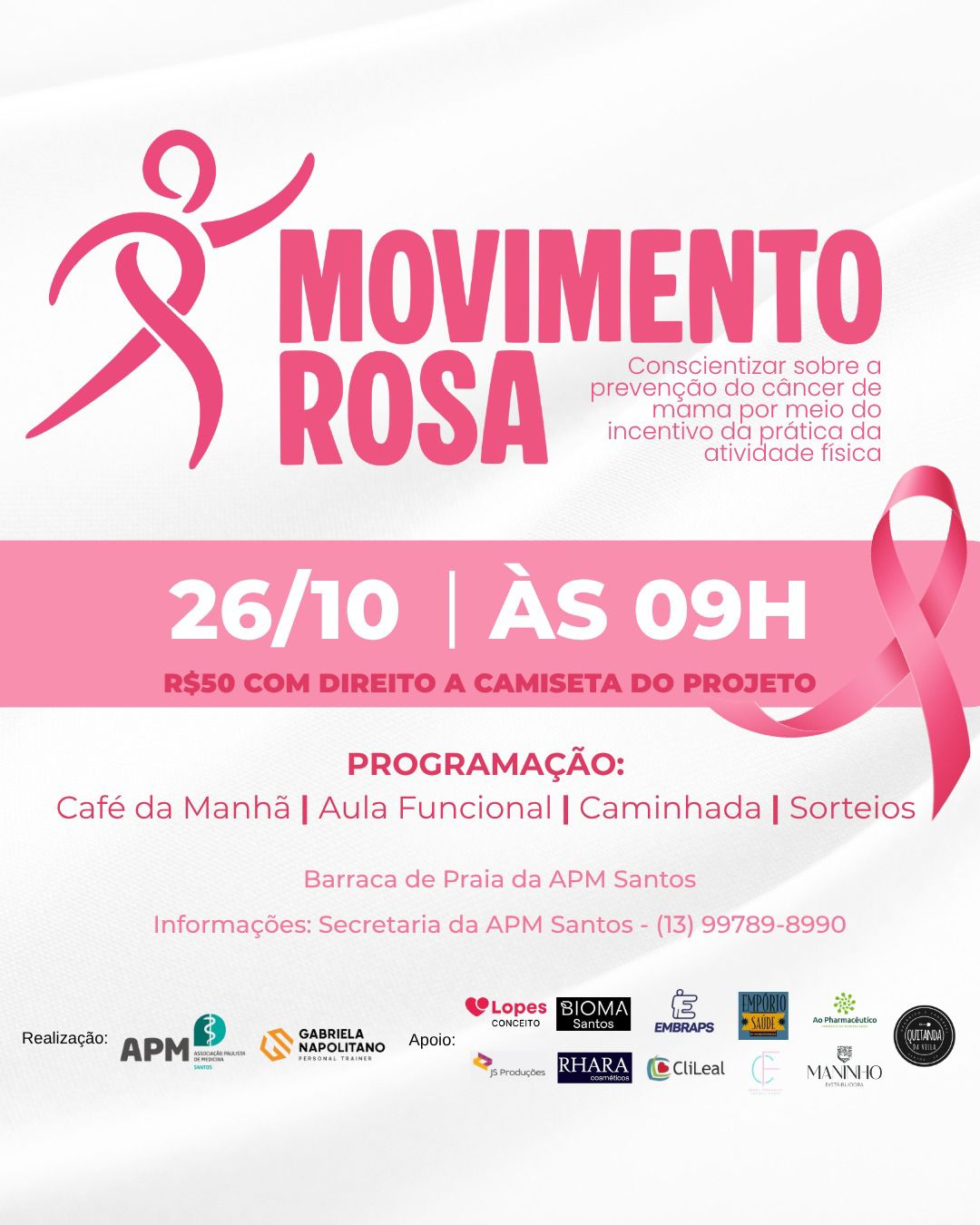 O evento acontecerá na Barraca da Praia da Associação dos Médicos e tem como objetivo conscientizar sobre a importância da prevenção do câncer de mama, incentivar a prática de atividades físicas entre pacientes oncológicas e arrecadar fundos para o Instituto Cenin.