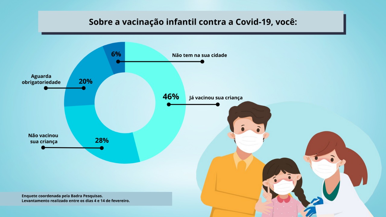 Diante disso, o Portal BS9 Litoral e Vale quis saber em sua última enquete: "Sobre a vacinação infantil contra a Covid, você:". Dos internautas que participaram, 46% disseram que já vacinaram sua criança, 28% afirmam que ainda não vacinaram, outros 20% aguardam a obrigatoriedade para vacinar o filho e apenas 6% disseram não ter vacina para crianças na cidade onde moram.
