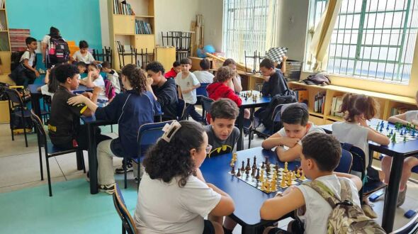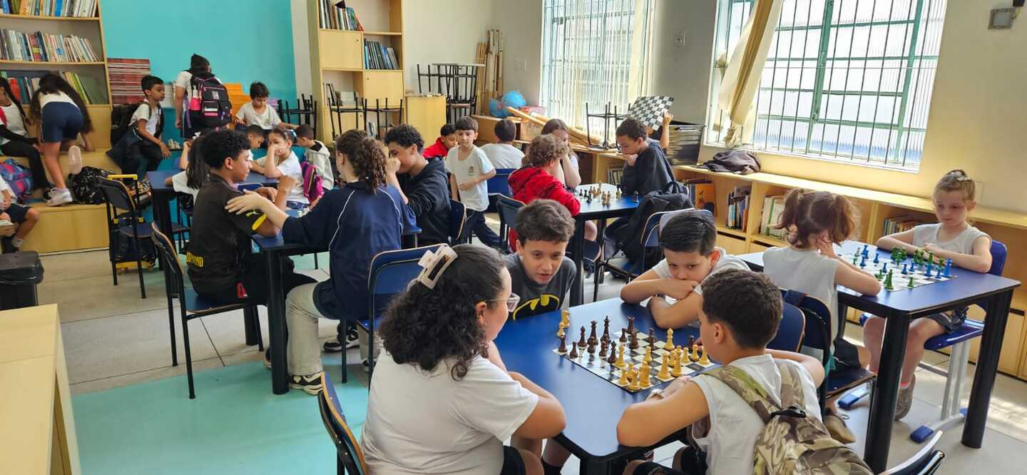 Mais de 90 crianças participam atualmente das aulas de xadrez na UME Cidade de Santos (Embaré).