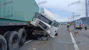 Caminhão bitrem perde o controle em curva da Rodovia SP-055, no km 255, bloqueando o sentido Leste por mais de três horas; motorista sai ileso