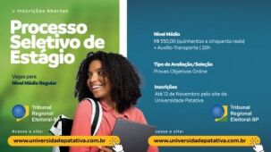 Interessados podem se inscrever até 12 de novembro e escolher entre zonas eleitorais e unidades na sede do Tribunal; valor da bolsa é de R$ 550 mais auxílio-transporte