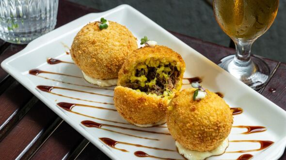 Bolinho de ragu de acém bovino com gorgonzola, empanado na farinha panko e molho de páprica (6 unidades) – R$ 59,90