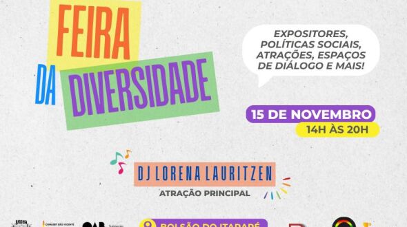 A Feira da Diversidade será realizada no próximo dia 15 de novembro (sábado), a partir das 10h, no Bolsão do Itararé, próximo à Barraca da Cris, em São Vicente. O evento faz parte da programação que antecede a Parada LGBT da Baixada Santista, organizada pela Associação da Parada do Orgulho LGBT de São Vicente (APOLGBT-SV), com apoio da Prefeitura de São Vicente e do Conselho Municipal de Políticas LGBT (CONLGBT).