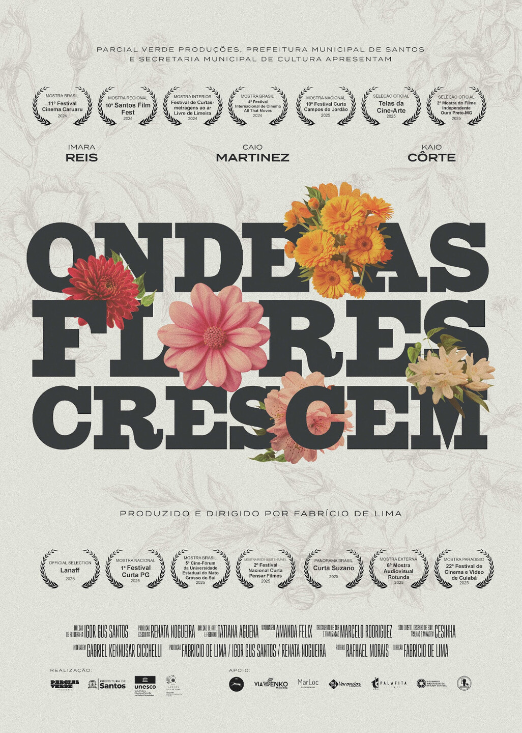 O curta-metragem "Onde as Flores Crescem", contemplado pelo 2º Concurso de Apoio a Projetos de Curtas-metragens no Município de Santos, segue em ascensão no cenário audiovisual nacional e internacional. Após estrear no 10º Santos Film Fest - Festival de Cinema de Santos, o filme dirigido pelo santista Fabrício De Lima alcançou mais de 30 seleções em festivais no Brasil e no exterior, consolidando-se como uma das produções mais premiadas do ano.
