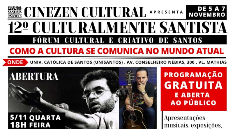 Estão abertas as inscrições gratuitas para a palestra de abertura do 12º Culturalmente Santista – Fórum Cultural e Criativo de Santos, realizado pelo Instituto CineZen Cultural, com apoio institucional da Prefeitura Municipal de Santos e apoio da Universidade Católica de Santos (Unisantos), Santos Film Fest – Festival de Cinema de Santos, Rizzieri Eventos e Cine Roxy.