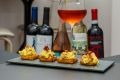 Bolinho de gravlax e brie, envolto em parma, sobre um ninho de massa filo e maionese de wasabi, finalizado com geleia de pimenta e broto de coentro (5 unidades) – R$ 60